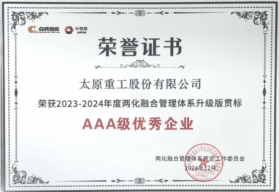 近日,太原重工股份有限公司成功獲評2023-2024年度兩化融合管理體系升級貫標(biāo)AAA級優(yōu)秀企業(yè),成為山西裝備制造業(yè)首家被工業(yè)和信息化部認(rèn)可的國家兩化融合管理體系A(chǔ)AA級的企業(yè),標(biāo)志著公司成為行業(yè)前列的兩化融合管理示范企業(yè)。